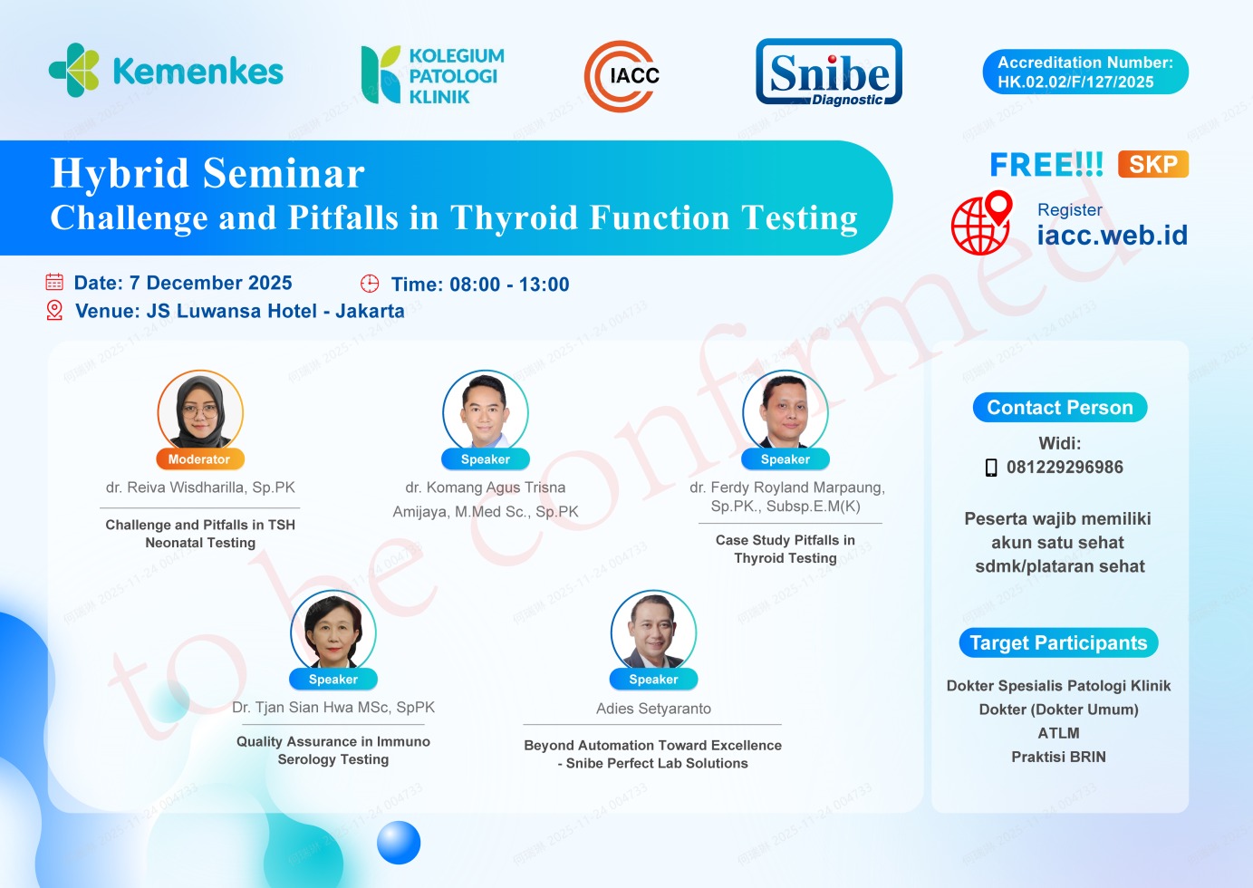 This seminar is organized by Kementerian Kesehatan RI, Kolegium Patologi Klinik, IACC, and Snibe Diagnostics, bringing together leading experts to share the latest insights, case studies, and best practices in thyroid function testing and immuno-serology.